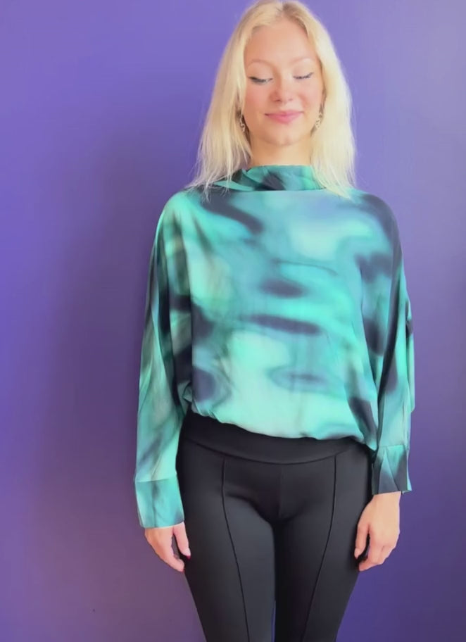 This beautiful soft printed blouse has raglan sleeves and is elastasized at the bottom which allows for the option of leaving it at the waist or hips. The rounded collar has two wide straps of different lengths that can be tied or not. The fabric is 100% Viscose that makes it very soft and drapey. Style this top with jeans and high boots, or with skirts or trousers - it is definitely a head turner. We've styled it both ways - wear the tie down at the front or in the back - you decide!