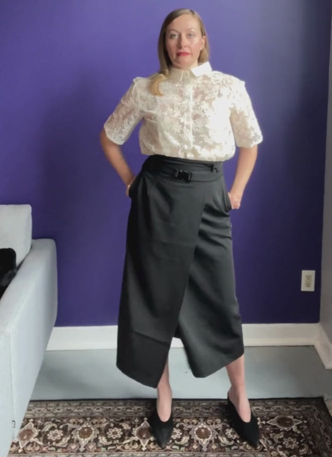 This classic black skirt from Coster is wrap style pencil skirt in a midi length. The composition is of cotton and polyester with a little stretch for comfort. It comes with a cloth belt with a buckle but you can also add your own belt for a different look. It also features pockets which we all love! Tuck in a blouse as shown or layer over one of the XD Xenia hoodies for a super cool, different look.