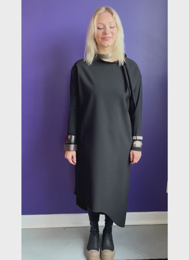 This solid black dress is reversible with a built in tie at rounded collar. The body has a structure but the long sleeves are in a softer fabric which allows for layering. The hem of this midi length is asymmetric which gives it a very fashionable look. The fabric is comprised of 68% Polyamide, 20% Viscose, 12% Elastane. The sleeves are 95% Viscose and 5% Elastane. This dress can be worn on its own or layered. Style this dress with a vest and boots or with some statement jewellery!