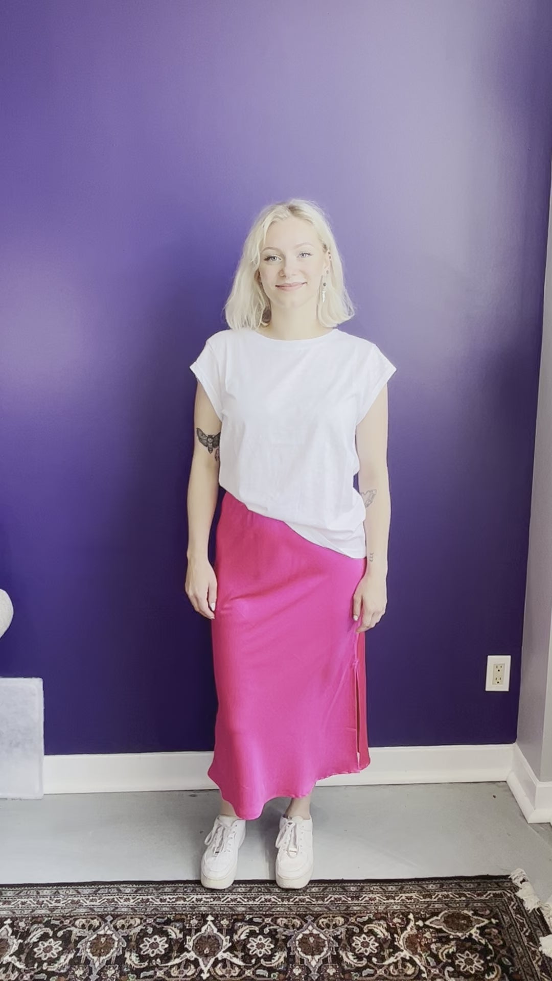 Skylar, is a long skirt with elastic at the waist and sway at the bottom. The fabric is super soft and delicious to wear.