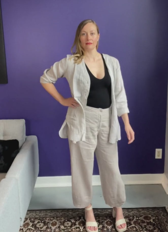 These 100% linen pants feature a front fly with a semi boxer waste for extra comfort. They are a barrel style leg which tapers at the ankle. This fashion forward style has side pockets and is made with quality linen and will be your go to pant all summer long. We have paired it with an open cardigan and also a linen dress for a more casual look. Both are elevated!