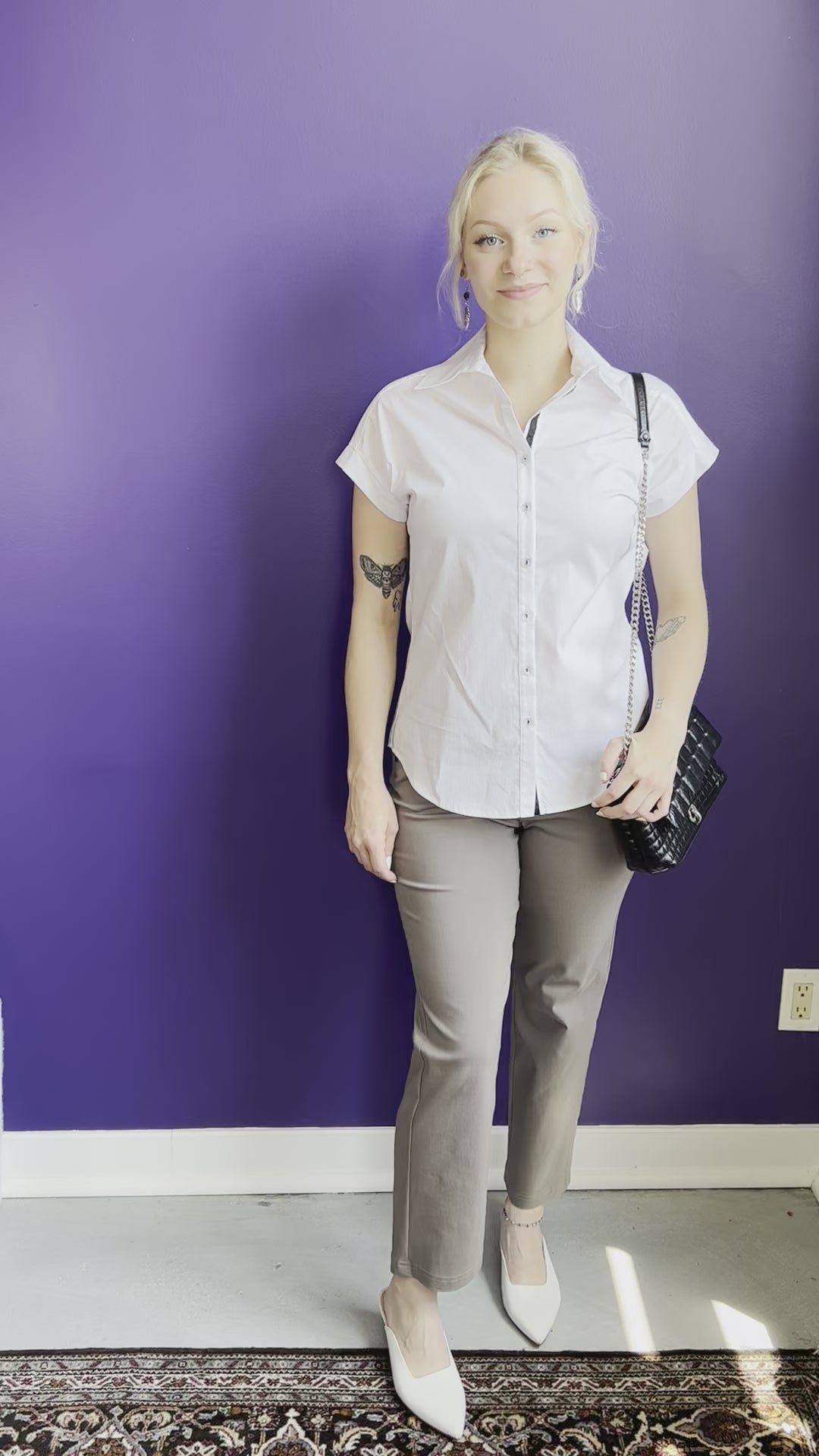 Our feminine take on the classic button down, this cotton poplin style features banded short sleeves and contrast trim down the front. Perfect for work or weekends, we love pairing this style with any cropped or long pant.