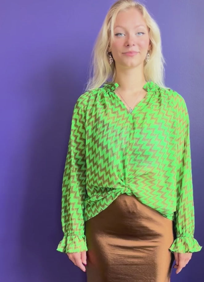 This beautiful blouse in a green and bronze zig zag print is made from 100% recycled polyester. It features a V neck with a ruffled collar and detailed elastic cuff. The sheerness allows for a lovely drape which can be worn tucked or untucked. We have tied it in the front in the featured photos.